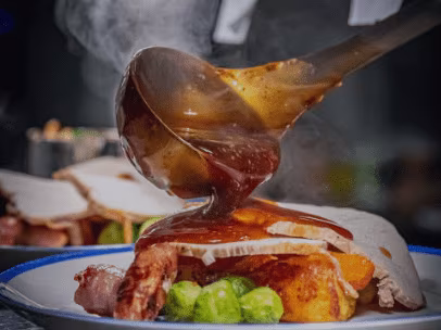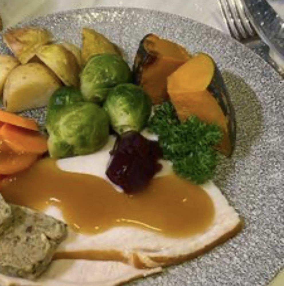 Juicy roasted turkey breast, roasted vegetables, brussel sprouts, carrots, stuffing, gravy and cranberry sauce.